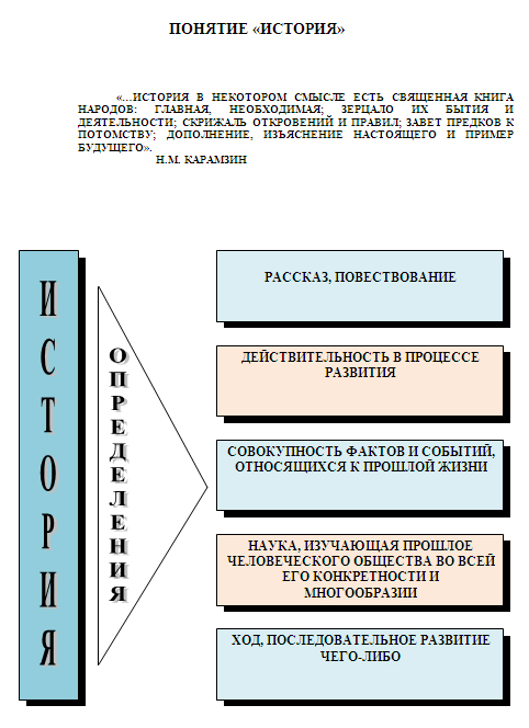 Понятие «история» заимствовано из греческого языка, происходит от греческого глагола «historia» – собирать свидетельства. В Древней Греции и в Древнем Риме оно обозначало повествование, рассказ о событиях, произошедших в прошлом. С течением времени смысловой объем слова расширился.