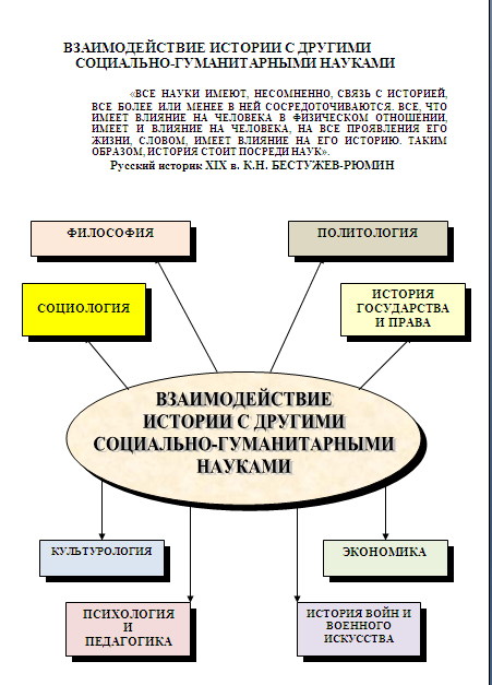 Место истории в системе наук. Сложившуюся совокупность общественных дисциплин, которые изучают различные аспекты человеческой цивилизации (история, философия, социология, политология, юриспруденция, филология, языкознание, этика и др.) в отличие от наук естественных и точных, принято называть системой гуманитарных наук. Будучи самостоятельными и относительно независимыми, они органически связаны между собой. Только в совокупности гуманитарные науки способны решить в диалектическом единстве главную задачу, стоящую перед человечеством: познание прошлого и современного состояния общества в целях познания его закономерностей, понимания его настоящего и перспектив будущего.