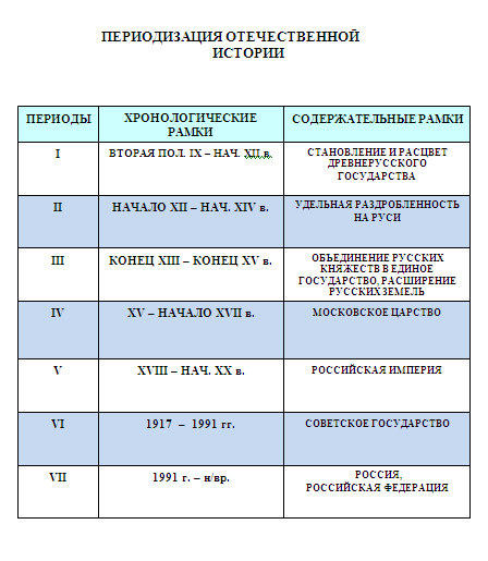 В практике изучения истории Отечества в современных условиях можно использовать следующую периодизацию:
