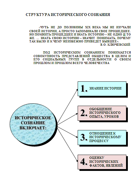 Иными словами, каждому человеку, особенно молодому, необходимо иметь историческое сознание, которое выступает важнейшим средством научного понимания сущности и форм социального развития и представляет собой синтез исторического знания, обобщения исторического опыта, вытекающих из него уроков истории, исторических традиций и научного прогноза будущего.