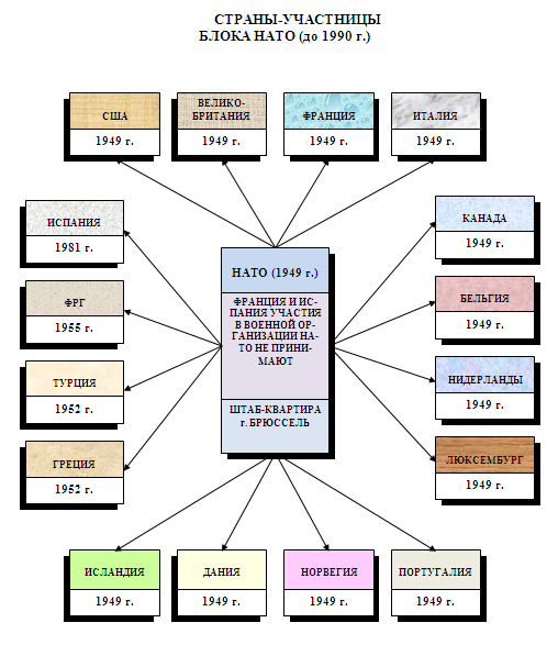 В 1949 г. странами Запада был создан самый мощный и объединивший 12 государств западного мира военно-политический союз НАТО во главе с США, имевший целью противодействие СССР и его союзникам.