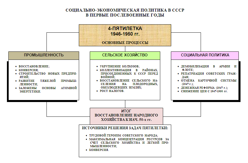 В промышленности первые послевоенные годы были отмечены бурным ростом (1946–1948 гг.) основных производств. По официальным данным, уже в 1948 г. объем промышленного производства достиг довоенного уровня, а в 1950 г. превысил его на 73 %. Только в 1948–1950 гг. было введено в строй свыше 6 тыс. крупных промышленных предприятий. При этом тяжелая промышленность увеличила производство в два раза. Этим успехам способствовал не только самоотверженный труд советских людей, но и максимальная концентрация ресурсов, достигнутая за счет «экономии» на сельском хозяйстве, легкой промышленности и социальной сфере. Немалую роль сыграли и репарации сГермании (4,3 млрд долларов). Они обеспечили обновление значительной части станочного парка промышленности.
