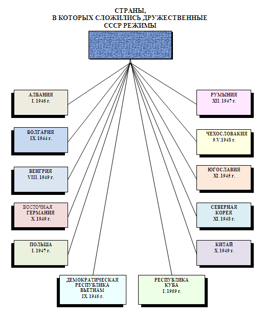 От империалистической системы отпали Польша, Чехословакия, Венгрия, Албания, Румыния, Болгария и Югославия. В этих странах начались социалистические преобразования. В Китае, Северной Корее и Северном Вьетнаме были образованы народно-демократические республики. За период 1945-1949 годы от системы империализма отпали государства Европы и Азии с населением более 700 млн. человек. Возникла мировая система социализма..