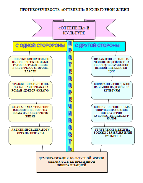 Именно культурное развитие общества в хрущевский период, с легкой руки писателя И.Г. Эренбурга, назвали периодом «оттепели». Но позитивные процессы в культурной жизни шли противоречиво.