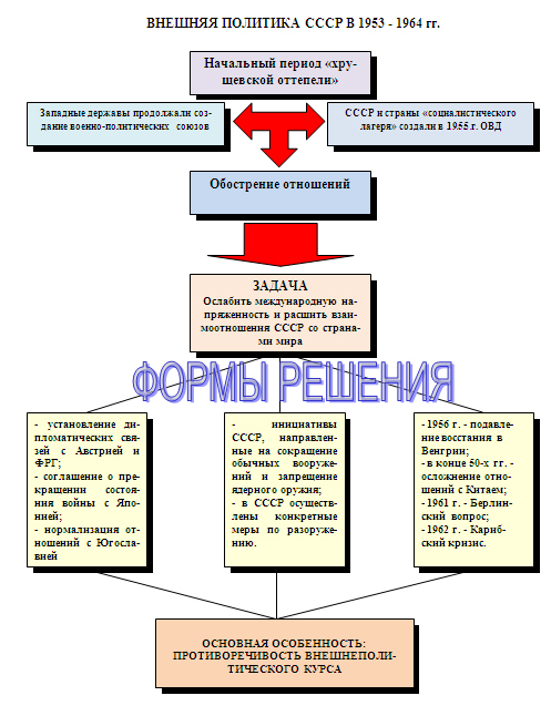 СССР и мировое сообщество. Смена власти привела к зарождению на разных уровнях общества тенденции к освобождению от догматов, господствовавших в годы правления Сталина, к более реалистичному и объективному анализу ситуации внутри страны, а также роли и места СССР в мировом сообществе. Все сколько-нибудь значительные вопросы – от экономических приоритетов до отношений с западным миром – оказались предметом дискуссии.