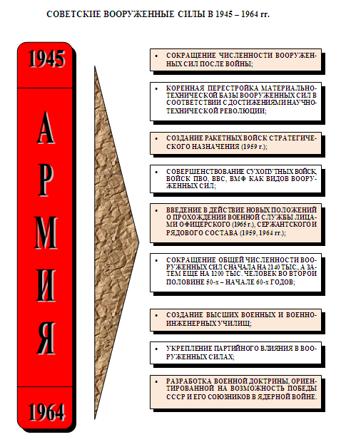 Военная политика. В 1950-е годы началась реорганизация Вооруженных Сил СССР, вызванная военно-технической революцией. Сущность ее заключалась в резком скачкообразном переходе к ракетно-ядерным средствам борьбы с соответствующими им новыми способами достижения стратегических целей войны. Указанные преобразования существенным образом изменили соотношение между профилями воинской деятельности в пользу инженерно-технического состава. В декабре 1959 г. было принято решении создать в СССР Ракетные войска стратегического назначения (РВСН).