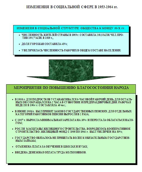 Скороспелые инициативы Хрущева в глазах общественного мнения компенсировались принятыми в 1955–1959 гг. многочисленными мерами по улучшению условий жизни населения, главным образом городского. Были повышены минимальная зарплата и размер пенсий. Снижены пенсионный возраст и продолжительность рабочей недели. Широкое развитие получило жилищное строительство. За 10 лет, с 1955 по 1964 г., городской жилищный фонд увеличился на 80 % (преимущественно за счет малоэтажных панельных домов – «хрущевок»).