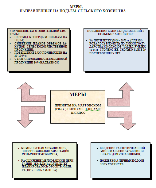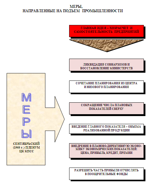 Реформа сложилась из решений мартовского (1965 г.) пленума ЦК КПСС, посвящённому сельскому хозяйству, и сентябрьского, того же года пленума, посвящённому промышленности. Суть решений этих двух пленумов ЦК КПСС состояла в переходе от плановой экономике к экономике с элементами рыночных (капиталистических) отношений с помощью реализации хозрасчёта и укрепления самостоятельности предприятий. Мало кто замечал, что этими решениями открывался путь к расгосударствлению, к потере преимуществ единого народнохозяйственного комплекса. Отвергая плановое руководство экономикой, отвергалась и необходимая ей предпосылка – общенародная собственность. Но об этом ничего не говорилось.