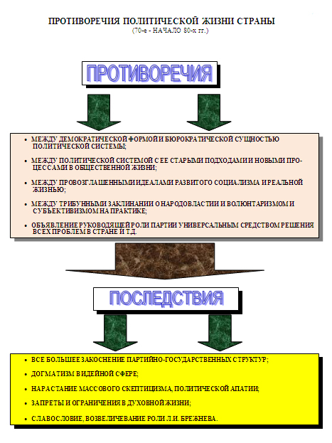 Противоречивость общественно-политической жизни. Вскоре после смены высшего руководства страны (1964 г.) началось ужесточение идеологического режима, постепенное сведение на нет либеральных начинаний, затухание критики культа личности, прекратилась реабилитация жертв сталинских репрессий.