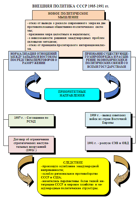 Сфера внешней политики. В основу нового внешнеполитического курса СССР была положена концепция нового политического мышления. Она исходила из тезиса о многообразном, но взаимозависимом и целостном мире, невозможности решения международных проблем силовым путем.