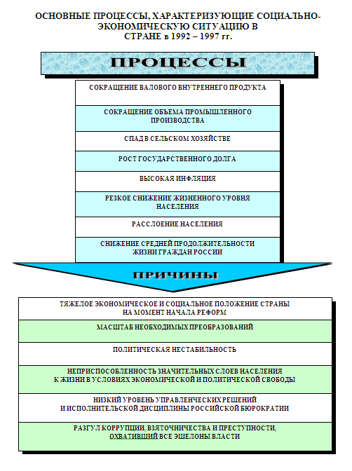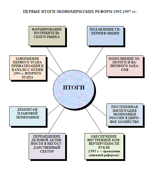 Таким образом, в результате «шоковой терапии» и приватизации в стране формировалась хозяйственно-экономическая модель, в основе которой преимущественное значение получила торговля денежными средствами, товарами, имуществом, услугами, а не развитие реального производства. В совокупности все эти факторы обусловили депрессивное состояние реального сектора экономики. Валовой внутренний продукт (ВВП) России сократился к 1996 г. по отношению к 1991 г. на 38 %, а общий спад производства во всех отраслях экономики привел к возрастанию доли убыточных предприятий до 50,6 %. Потери российской экономики за этот период в 2,5 раза превысили потери СССР в Великой Отечественной войне и равнялись 9 540 трлн руб. в ценах 1995 г.