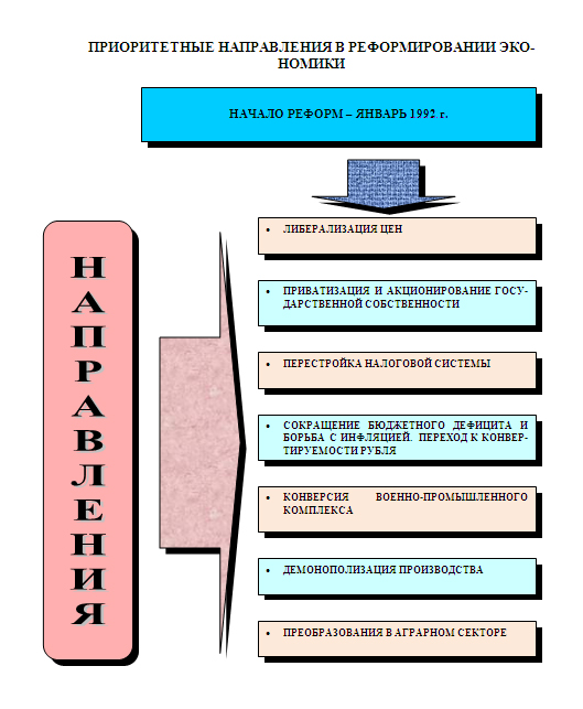 В конце 1991 г. российское правительство под руководством Б. Ельцина и Е. Гайдара приступило к реализации программы радикальных экономических реформ.Главными направлениями преобразований стали: «шоковая терапия», разгосударствление и приватизация общенародной собственности, природных недр; создание рыночной экономики и инфраструктуры; ликвидация колхозно-совхозной системы в сельском хозяйстве.