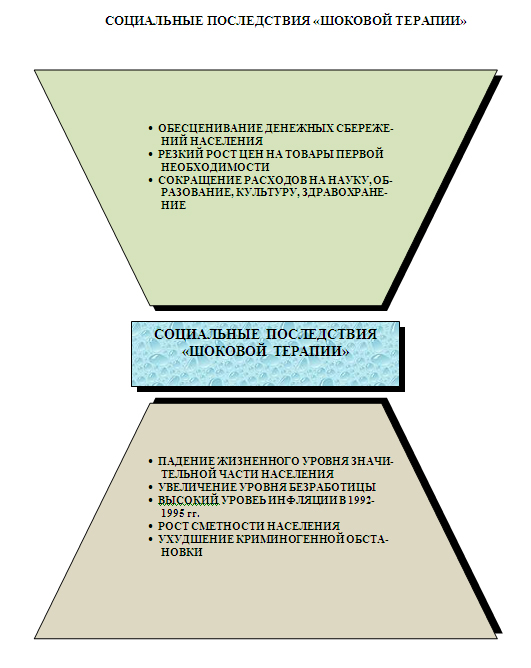 Политика «шоковой терапии».Экономическая реформа начала реализовываться методом, получившим название «шоковой терапии». Замысел «шоковой терапии» состоял в одномоментном введении капиталистического механизма. Прочной опорой режима, создающего капиталистический строй, могут быть только собственники. Поэтому, чтобы не утратить власть, и было решено создать их ускоренными темпами.