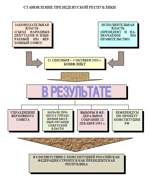 Уничтожив огнем танковых орудий представительные органы власти, президентская сторона приступила к окончательному демонтажу советской политической системы, а попутно к выстраиванию жесткой вертикальной структуры президентской власти. До начала деятельности Федерального собрания Ельцин возложил на себя полномочия по обеспечению прямого президентского правления, а 7 октября 1993 г. установил порядок, в соответствии с которым главы администраций субъектов Федерации стали назначаться президентом РФ по представлению Правительства России. В октябре указами президента РФ была прекращена деятельность Советов всех уровней. Вместо них на местах предписывалось образовывать краевые и областные Законодательные собрания, городские и районные думы численностью от 15 до 50 депутатов, полномочия которых были в значительной мере ограничены. Выборы в новые местные представительные органы прошли в период с декабря 1993 г. по июнь 1994 г. До выборов вся полнота власти на местах передавалась главам местных администраций, советская система народовластия разрушалась до основания. Знаковыми с точки зрения разрушения власти Советов были замена герба РСФСР царским двуглавым орлом и введение в качестве государственного гимна «Патриотической песни» (без слов) М.И. Глинки. В целом в результате государственного переворота в сентябре — октябре 1993 г. президент РФ коренным образом видоизменил политическую систему страны в сторону установления единоличной диктатуры.