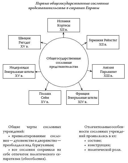 Наступает эпоха сословно-представительных монархий. Именно в этот период начинается практическое осуществление принципа разделения властей и возникают первые парламенты – сословно-представительные органы, значительно ограничивающие власть короля. Ранее всего такой парламент – кортесы появился в Испании (конец XII – начало XIII в.). В 1265 г. парламент начинает свое существование в Англии. В XIV в. парламенты уже были созданы в большинстве стран Западной Европы. За ними постепенно закреплялись законодательные функции и намечалось определенное противостояние с королями.
