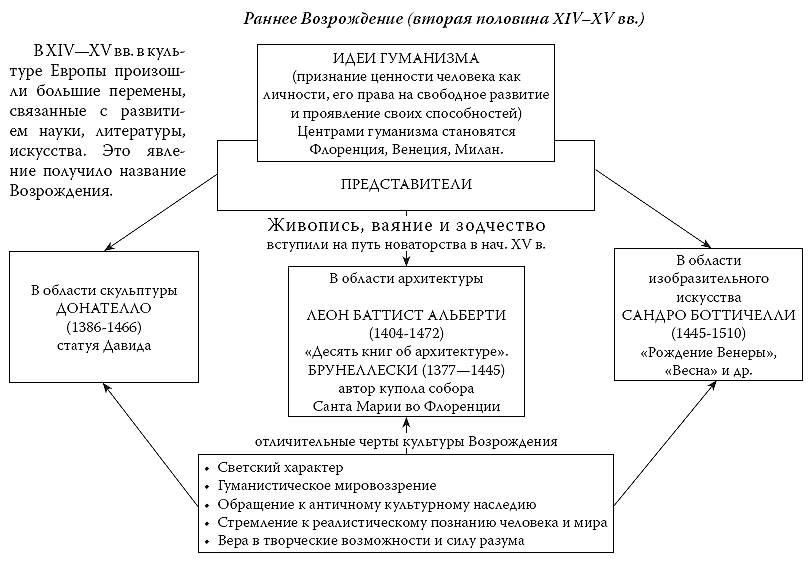Духовный взлет в эпоху Возрождения. В XIV–XV вв. в культурной жизни Европы происходят большие перемены, связанные с быстрым прогрессом науки, литературы, искусства. Это явление получило название Возрождения (эпоха Ренессанса началась в конце XIV в. в Италии). Деятели Возрождения считали, что после гибели Античности наступил период упадка – Средние века. И только теперь начинается возрождение античной образованности, науки, культуры. В Италии сохранилось многое из античного наследия, и сюда бежали, спасаясь от турок, образованные люди из Византии. С XIV в. любители античности развивали в первую очередь в литературе идеи гуманизма (признание ценности человека как личности, его право на свободное развитие и проявление своих способностей). Позже их самих начали называть гуманистами. Центрами гуманизма становятся Флоренция (центр живописи), Венеция, Милан.