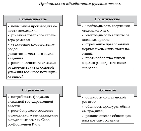 В числе социальных предпосылок следует назвать заинтересованность в сильной власти фактически всех слоев населения (дворяне, население посадов, крестьянство и пр.), необходимость государственной помощи переселенцам с юга. Исключительно важное значение имели политические причины и обстоятельства единения: необходимость свержения ига, защиты западных рубежей; рост сопротивления смердов как результат усиления их эксплуатации; стремление церкви к единой государственной власти (огромная земельная собственность у храмов и монастырей). Помимо сказанного, немаловажными были и духовные факторы: осознание единства русского народа в ментальности людей различных земель; объединительная направленность православной религии в борьбе с католической и мусульманской экспансией.