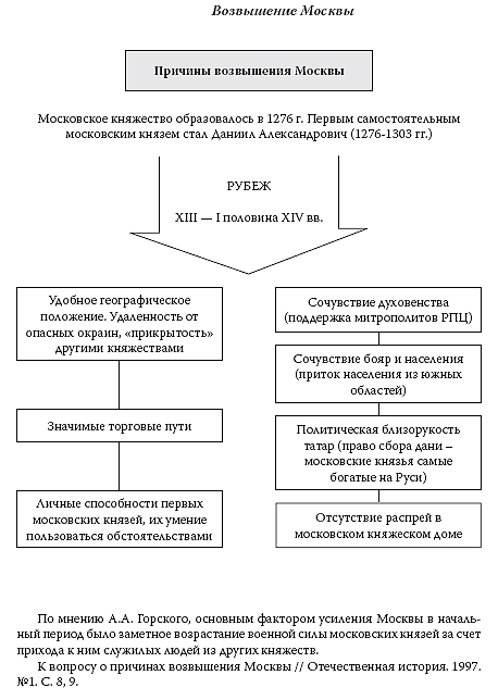 Объединяя различные позиции, следует выделить определяющие факторы усиления московских властей. К ним относились: выгоды геополитического положения (перекресток торговых путей, транспортный, товарный узел); контроль над речными торговыми путями, соединенными с «демографическим фактором» (в Подмосковье шел постоянный приток населения из земель, подвергавшихся частым нападениям ордынцев); роль личностей первых московских правителей (богатство приумножалось путем дальновидной политики, военных захватов, кровавых убийств, расчетливого лавирования, подкупа золотоордынских ханов, династических браков, покупки за деньги целых сел и городов; причем все это было характерно и для нравов Западной Европы). К тому же московские князья оказались рачительны и бережливы. В.О. Ключевский писал о них: «Они хорошие хозяева – скопидомы по мелочам, понемногу». И наконец, среди них отсутствовали внутренние междоусобицы (в отличие, например, от тверских князей) в процессе передачи московского престола.