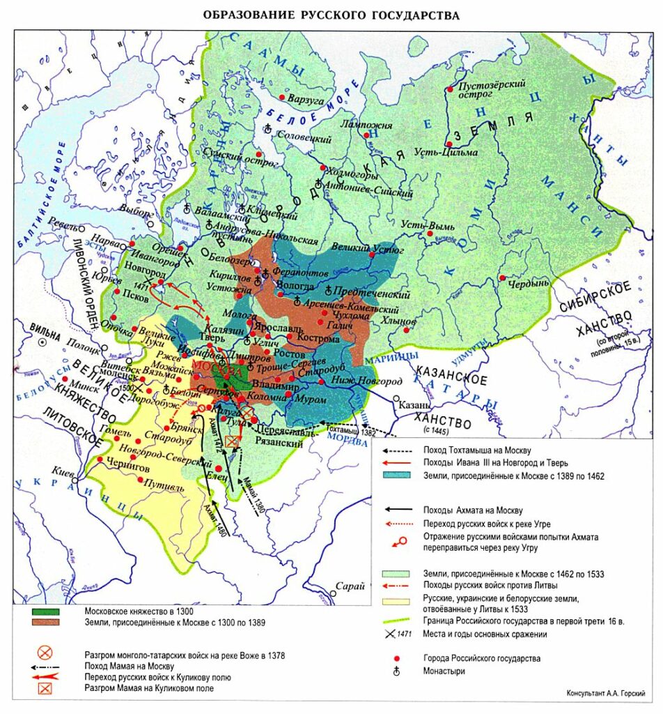 Основные черты процесса формирования Московского государства. Первая черта. Настойчивые поступательные действия московских князей по объединению русских земель, что обусловливало постоянный рост московской территории.