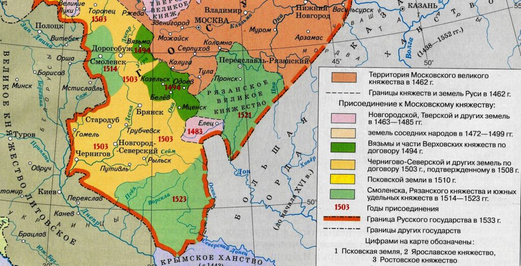 Объединительный процесс завершился в первой четверти XVI в. При Василии III был присоединен к Москве Псков (1510), в ходе нескольких походов – Смоленск (1514), затем – Рязань (1521). Постепенно на смену наименованию Русь приходит новое – Московия, или Россия.