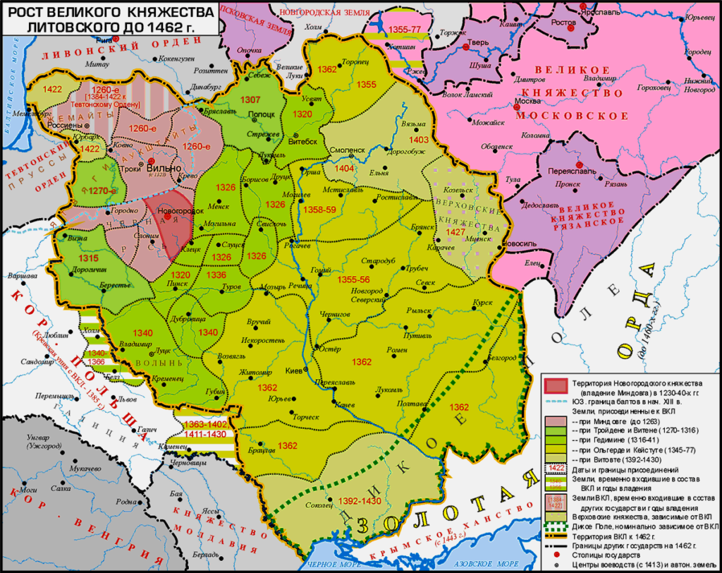 Литва как один из центров объединения русских земель. К середине XIII в. русские земли оказались между Золотой Ордой и Великим княжеством Литовским, которое основал князь Миндовг, объединивший прибалтийские племена в первой половине данного столетия в единое раннефеодальное государство. Впоследствии в XIII–XIV вв. в его состав вошла огромная территория, ранее являвшаяся частью Киевской Руси. Правители «Великого князства Литовского, Жомойтского и Руского» (Витень, Гедимин, Ольгерд) неуклонно раздвигали границы государства, включавшего земли всей современной Беларуси, часть Волыни, Киевщину, Черниговщину, а позднее и Смоленщину. К началу XV в. восточные пределы Великого княжества Литовского доходили до Оки, а южные достигали Черного моря.