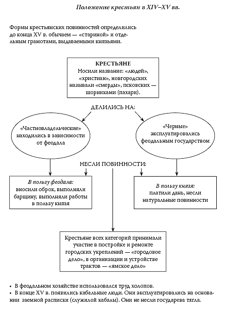 Основу земельного фонда составляли так называемые черные земли, принадлежавшие государству. Население этих земель – «черные люди» (впоследствии «черносошные крестьяне»), были обложены данью и всякими поборами в пользу государства или князя (часть собранных сборов шла в Орду). Характерным для «черных земель» было общинное землевладение крестьян с индивидуальным владением приусадебным участком и пашенной землей, наличие выборного крестьянского волостного самоуправления под контролем представителей княжеской администрации – наместников и волостелей. Большинство «черных земель» находилось в северных районах страны. Налагая на общину многочисленные и тяжелые обязанности, осуществляя контроль за некоторыми сторонами ее деятельности, государственная власть не вмешивалась во внутреннюю жизнь общины.