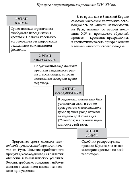Усложнение хозяйственных связей, тяжелые природно-климатические условия, усиление эксплуатации в условиях повышения государственных потребностей вели к переменам в правовом положении частновладельческих крестьян, постепенно лишавшихся права ухода от своих владельцев и перехода к другим феодалам. С начала XV в. постепенно теряли право перехода «старожильцы». Затем стало подвергаться ограничениям право «выхода» от землевладельцев и крестьян других категорий. Так, в отдельных княжествах для крестьян был установлен один и тот же срок отказа (расчета с землевладельцем с правом ухода от него): за неделю от Юрьева дня осеннего (26 ноября) и в течение недели после этой даты. С образованием единого государства и изданием в 1497 г. общерусского феодального кодекса права — Судебника правило о Юрьеве дне было распространено на все категории крестьян и по всей территории страны.