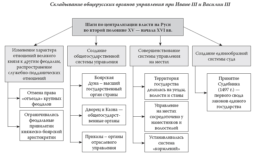 Идеологическая «скрепа» государственности в конце XV в. была дополнена созданием законодательного кодекса – Судебника 1497 г., установившего единые правовые нормы для всей страны. В его составлении участвовали авторитетные и образованные люди – князь Иван Патрикеев, дьяк Федор Курицын. Главной целью Судебника было распространение полномочий великого князя на всю территорию государства, что означало ликвидацию юридических суверенитетов отдельных уделов и земель. Территория страны делилась на уезды (в Новгородской земле – на пятины), волости, станы.