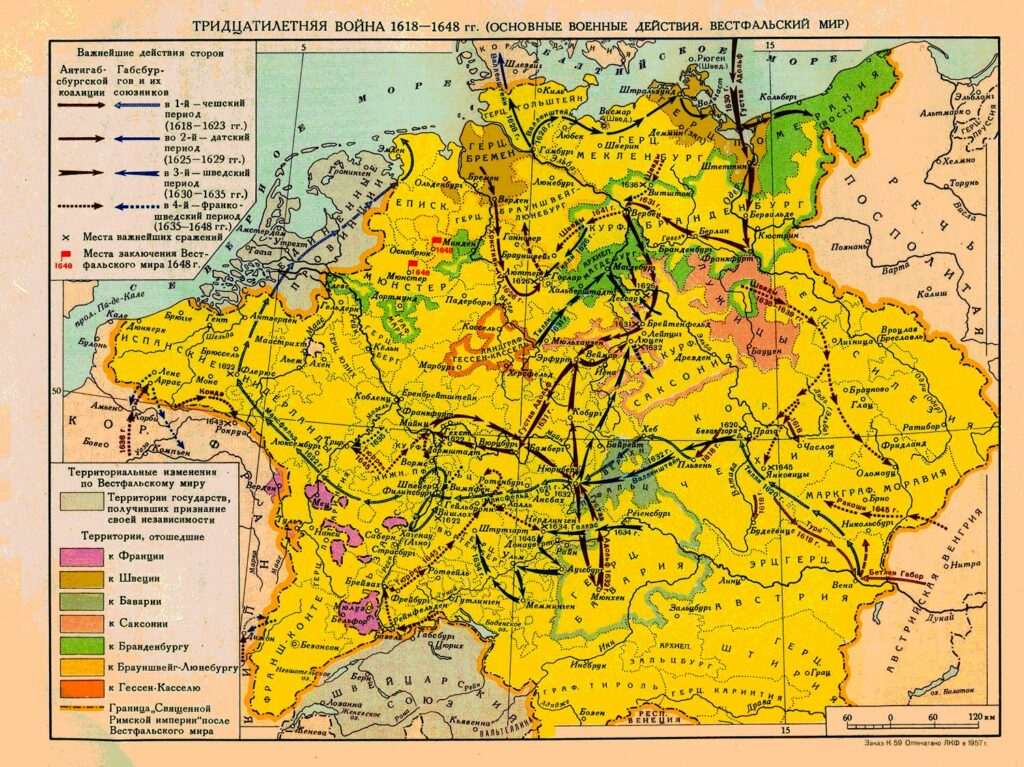 В первой общеевропейской Тридцатилетней войне участвовало большинство европейских стран, сочетавших в конфликте разнообразные политические противоречия и религиозную рознь. Поводом для начала войны стало восстание против императора в Праге. Католическая армия двинулась на повстанцев и в 1620 г. разгромила их под Прагой. В Чехии начались расправы над протестантами. Но в дальнейших боевых действиях последние стали брать верх, к тому же участники войны были истощены, и начались переговоры о мире. Вестфальский мир (1648 г.) отразил новое соотношение сил в Европе. Испания утратила преобладание. Швеция получила владения на севере Германии и стала господствующей державой на Балтике. Франция отобрала у империи Эльзас и укрепила свое влияние на Рейне. Со временем Голландия и Швейцария получили признание своей независимости. Затяжная и разорительная для всех участников война показала бесплодность попыток решать религиозные конфликты военным путем.