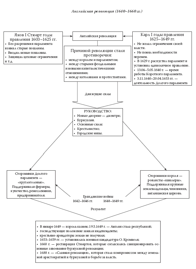 Великая английская революция (1640–1660). Накануне ее Англия испытала жестокий финансовый кризис. В стране шли массовые гонения на пуритан – английских кальвинистов, которые хотели полностью очистить церковь от влияния католичества. Большую роль в обострении кризиса сыграли и действия английских королей – Якова I и Карла I, которые привели к разрыву с парламентом. Англия раскололась на два лагеря: поддерживавших короля кавалеров и сторонников решительных буржуазных реформ – круглоголовых.