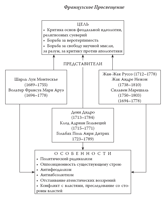В наиболее ярких, классических формах идеология Просвещения развивалась во Франции. Крупнейшими его представителями были Ф. Вольтер, Ж.-Ж. Руссо, Ш. Монтескье, К. Гельвеций, Д. Дидро. Идеология Просвещения отражала взгляды и потребности буржуазии в борьбе против феодализма и его духовной опоры – католической церкви. Фактически все французские и английские просветители XVIII в., и в особенности П. Гольбах и Д. Юм, в той или иной форме подвергали сомнению основные идеи христианства. Великая французская революция (1789–1794), объявившая свободу совести, заменила религию «культом Разума», вызвала всплеск антирелигиозных выступлений в обществе и привела к изгнанию многих священников из Франции.