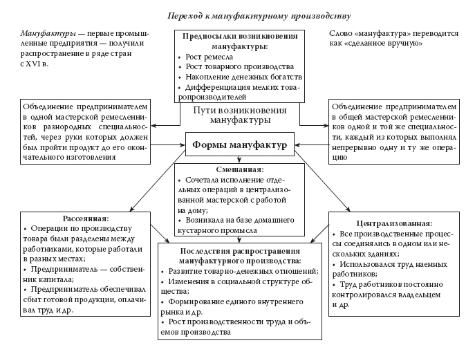 Развитию мануфактурного производства соответствовали три формы мануфактуры: рассеянная, смешанная и централизованная. Мануфактура вела к специализации рабочих и разделению труда между ними, что, с одной стороны, повышало его производительность, а с другой – усиливало степень эксплуатации рабочего.