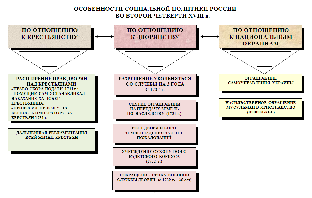 Правительство Анны Иоанновны проявляло особую заботу о дворянском сословии. Был отменен петровский Указ о единонаследии (1731), что дало право помещикам делить свои имения. В 1731 г. был создан Шляхетский корпус, что привело к освобождению дворянства от обязанности начинать военную службу солдатами. В 1736 г. специальным указом воинская служба дворян была ограничена 25-летним сроком, а один из сыновей дворянской семьи вообще освобождался от военной службы.