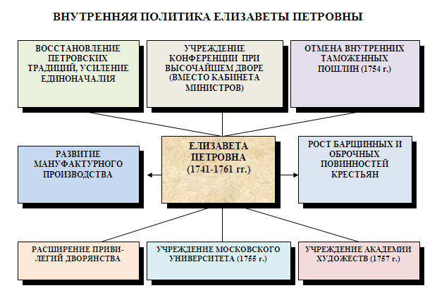 Основной целью своего правления Елизавета провозгласила возвращение к политике Петра I. В отличие от Анны Иоанновны новая императрица пыталась принимать активное участие в государственных делах. Внутренняя политика Елизаветы Петровны характеризуется многими важными мероприятиями. Был упразднен кабинет министров (но права Сената не были восстановлены), была создана личная канцелярия Ее Императорского Величества (с 1756 г. – Конференция, в штат которой были зачислены 10 ее ближайших помощников). Некоторые государственные институты – Главный и городские магистраты, некоторые коллегии (берг- и мануфактур-коллегии) были восстановлены. Многие иностранцы были устранены из сфер государственного управления и образования и заменены русскими. Рекрутская повинность была облегчена (Россия была разделена на 5 округов, каждый из которых по очереди поставлял по рекруту со 100 ревизских душ). Крестьянам простили недоимки за 17 лет (1741), но одновременно были повышены косвенные налоги.