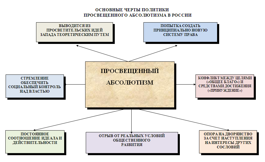Просвещенный абсолютизм. Просвещенным абсолютизмом называют особую разновидность абсолютизма, которая предполагает смягчение произвола самодержца благодаря введению прогрессивных политических институтов (повышение значения независимого суда и законов, использование элементов разделения властей), распространению образования, поддержке общественного мнения и самоуправления. Существует мнение о том, что просвещенный абсолютизм был навеян идеями французских философов, в жизни же в основном сводился к демагогии и показухе.