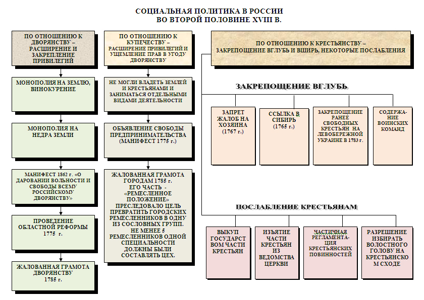 Правление Екатерины II, которая на словах придерживалась идей европейского гуманизма и Просвещения, на деле ознаменовалось максимальным закрепощением крестьян и всесторонним расширением дворянских полномочий и привилегий. Ею были проведены нижеследующие реформы.