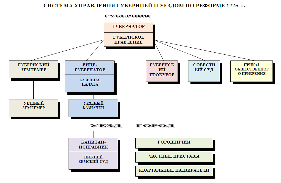 В-третьих, губернская реформа 1775 г. Было проведено более четкое территориальное деление империи. Территория страны стала делиться на административные единицы с определенным количеством податного (платившего налоги) населения.