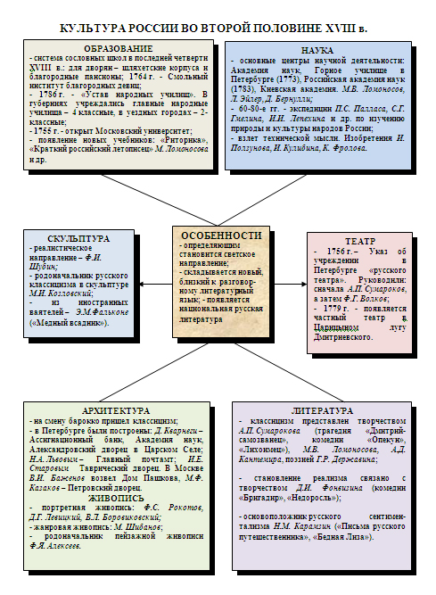 Русская культура XVIII века: от петровских инициатив к «веку Просвещения». Характерной особенностью русского культурного развития Петровской эпохи был светский характер культуры, ослабление духовного господства церкви в обществе. Техническое развитие страны послужило сильным толчком к распространению светского образования и научных знаний.