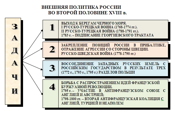 Во второй половине XVIII в. Россия решила две внешнеполитические задачи: добилась выхода к Черному морю и распространила свою власть на все восточнославянские земли с православным населением. Это потребовало длительной борьбы с Турцией и вовлекло Россию в раздел Польши.