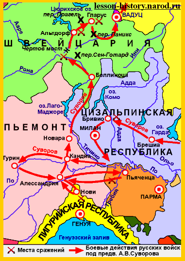 Итальянский и Швейцарский походы А.В. Суворова (1799). В начале 1793 г. были разорваны все отношения России с Францией. В 1798 г. Россия вступила в антифранцузскую коалицию вместе с Англией, Австрией, Турцией и Неаполем. Цель коалиции заключалась в изгнании французов из Италии.