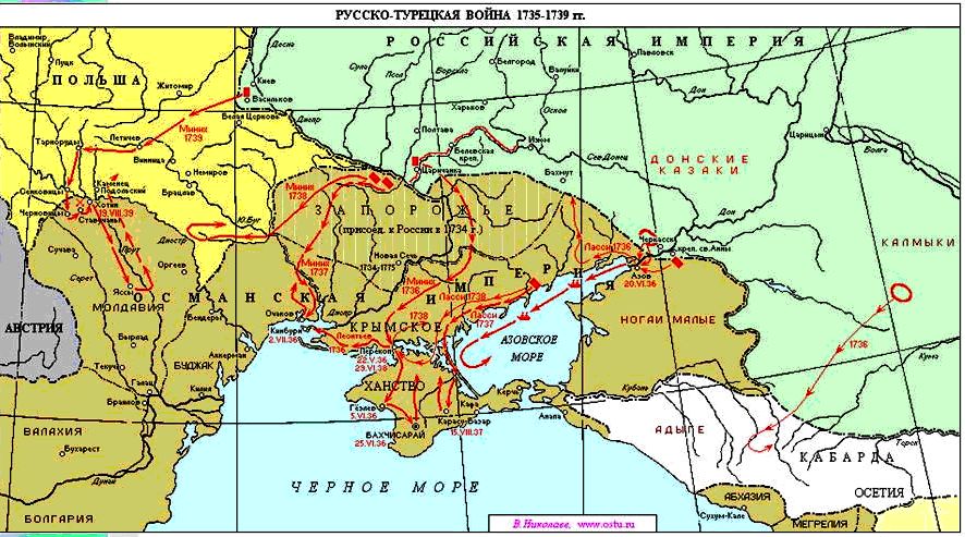 В 1737–1739 гг. русские войска ценой больших потерь взяли турецкие хорошо оборудованные крепости Очаков и Хотин. В 1739 г. был подписан Белградский мир. Россия получила Азов, но укрепления его были разрушены. Остальные захваченные крепости пришлось вернуть Турции.