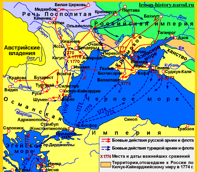 Русско-турецкая война (1768–1774). Османская империя, обеспокоенная ростом русского влияния в Польше и подстрекаемая Францией, потребовала от России вывести войска из Польши. Получив отказ, Порта в конце 1768 г. объявила России войну.