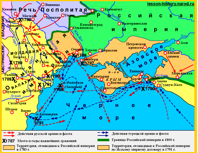 Турки пытались внезапным ударом захватить крепость Кинбурн, но были отбиты войсками А.В. Суворова. В 1788 г. русские войска овладели Очаковом – мощной крепостью, считавшейся «ключом к Черному морю». В 1789 г. Суворов с 25 тыс. русских и австрийских солдат наголову разгромил 30 тысячную турецкую группировку у Фокшан, а затем одержал выдающуюся победу у р. Рымник. В августе 1790 г. выдающуюся победу у о. Тендра одержал русский флот под командованием Ф.Ф. Ушакова. Господство на море перешло к России.