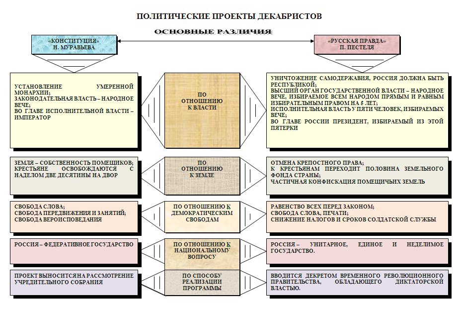 В тайных обществах подготовили конституционные проекты, наметили планы совместного выступления в 1826 г. Уставная грамота Славяно-русской империи, впоследствии – Конституция Н.М. Муравьева имела сходство с проектом Н.Н. Новосильцева.