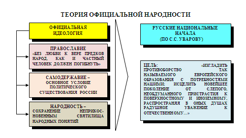 «Православие, Самодержавие, Народность». Со второй половины 20-х годов консервативно-охранительное направление приобрело стабильный, целенаправленный характер. «Николаевское» просвещение, высшая полиция (политический сыск III отделения), Синод и духовенство, министерства и чиновничество руководствовались государственной идеологией – теорией официальной народности (самодержавие, православие, народность). Министр народного просвещения граф С.С. Уваров выдвинул триединую формулу социально-политической стабильности Российской империи: «православие, самодержавие, народность».