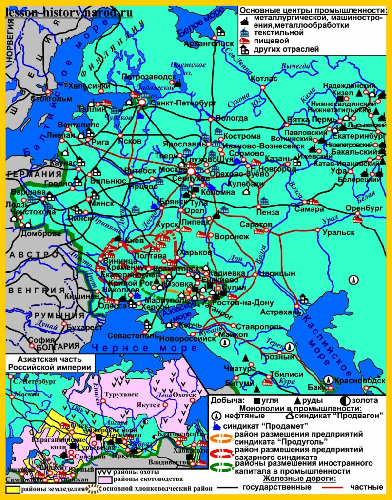 Экономическая модернизация. К началу XX в. Россия вошла в пятерку наиболее развитых промышленных стран мира. За 40 пореформенных лет общий объем промышленного производства вырос в 7 раз. Высокими темпами развивались базовые отрасли машинной индустрии: машиностроительная, топливная, горно-металлургическая. Возникли банки, тесно связанные с промышленностью. Продолжался процесс концентрации производства и капитала. Быстрое развитие железных дорог связывало центр и окраины Российской империи.