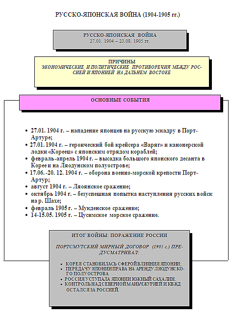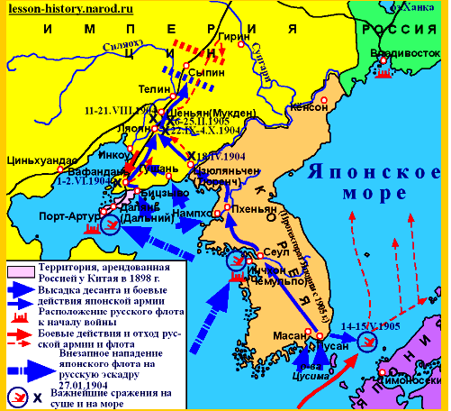 Русско-японская война. Необходимость ускорения модернизации, повышения военно-экономического потенциала страны наглядно продемонстрировала война с Японией. С 90-х годов XIX в. Россия значительно активизировала дальневосточное направление своей внешней политики. На арендованном у Китая Ляодунском полуострове была создана российская военно-морская база Порт-Артур, от Читы до Владивостока через китайскую территорию построена Китайско-Восточная железная дорога.