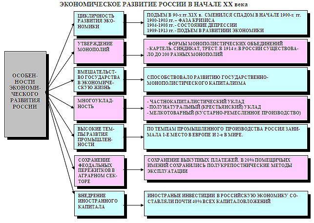 В 1901–1914 гг. крупнокапиталистические формы производства заняли господствующие позиции в российской промышленности, началось ее сращивание с банками, в основном сложилась отраслевая и региональная структура производства. За этот период промышленное производство в стране удвоилось, заметное влияние приобрели монополистические и государственно-монополистические объединения.
