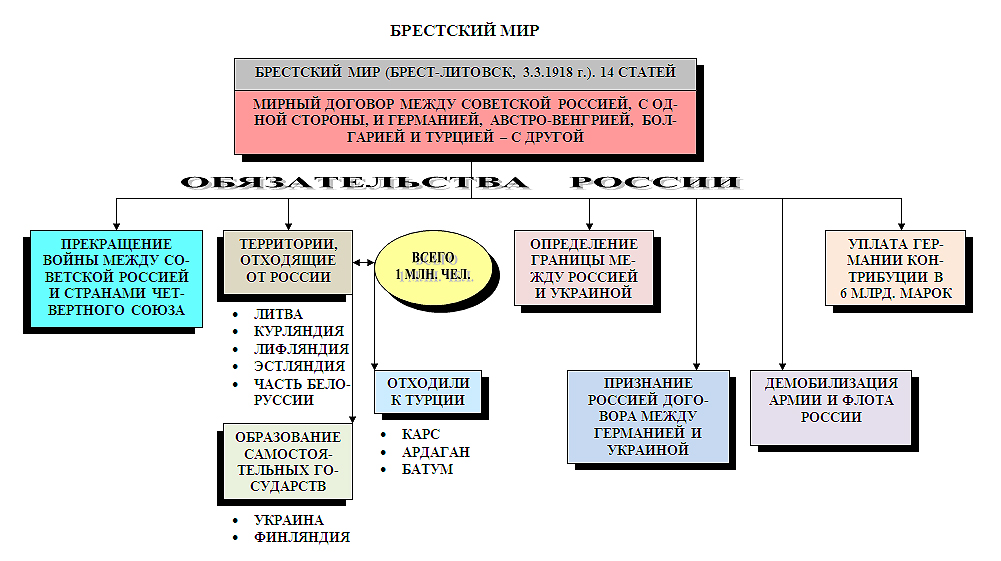Еще одним событием, которое усилило размежевание в российском обществе и привело к кризису в правительстве, партии большевиков, явились переговоры и подписание мирного договора Советской России с Германией и ее союзниками 3 марта 1918 г. в Брест-Литовске. По его условиям от России отторгались Прибалтика, часть Белоруссии. Советские войска должны были покинуть Украину, Финляндию, Аландские острова, а также округа Ардагана, Карса и Батума, которые передавались Турции. По разным оценкам, страна теряла около 1 млн кв. км территории, на которой проживало примерно треть ее населения, находилось до половины всей промышленности и 40 % промышленных рабочих. Наряду с другими условиями Россия обязана была также уплатить Германии контрибуцию в размере 6 млрд марок.