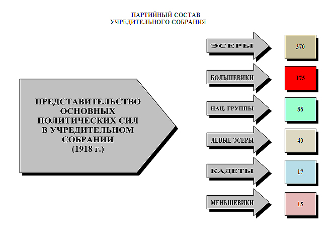 В ходе выборов, по подсчетам Л.Г. Протасова, по 75 избирательным округам большевики получили лишь 22,4 % голосов. В то же время представители других социалистических партий ˗ свыше 58 % (из них более 39,5 % набрали эсеры, 14,5 % – националистические социалистические партии, 3,2 % – меньшевики и 0,9 % – эсеры), а представители различных буржуазных и национальных несоциалистических партий – 15,5 % голосов. Членами Учредительного собрания были избраны лидеры всех крупнейших российских и национальных партий, вся либеральная и демократическая элита. С таким составом депутатов трудно было ждать покорного законодательного утверждения свершившегося факта – захвата большевиками власти.